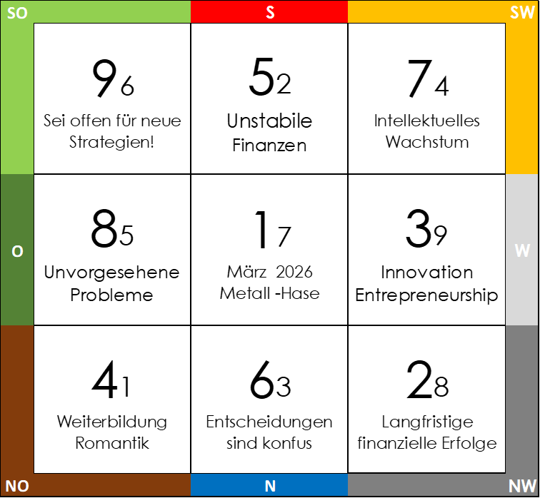 2026 wird der Nordwesten zu einem eher herausfordernden Bereich. In der 9er Periode gehört er offiziell zu den vielversprechenden Sternen, aber in der jährlichen und monatlichen Vorhersage herrscht noch das Krankheits-Potential vor und das sicher noch die nächsten Jahre. Achte hier besonders auf deine Gesundheit und vermeide unnötigen Stress. Analog zum Stern 5 kannst du in diesem Bereich dieses Jahr ein Salzglass oder schweres Metall aufstellen.
